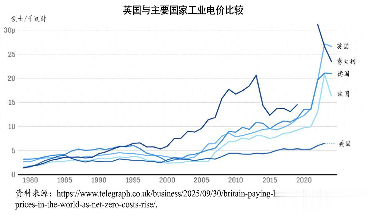 根据2025年9月30日国际能源署发布的数据,英国工业企业支付的工业电价是发达国家中最高的。2024年,英国工业企业用电的平均价格达到每千瓦时26.6便士,法国为16.3便士,德国为21便士,意大利为23.5便士,2023年美国为每千瓦时6.5便士。英国工业支付的电力价格比法国高63%,比德国高27%。