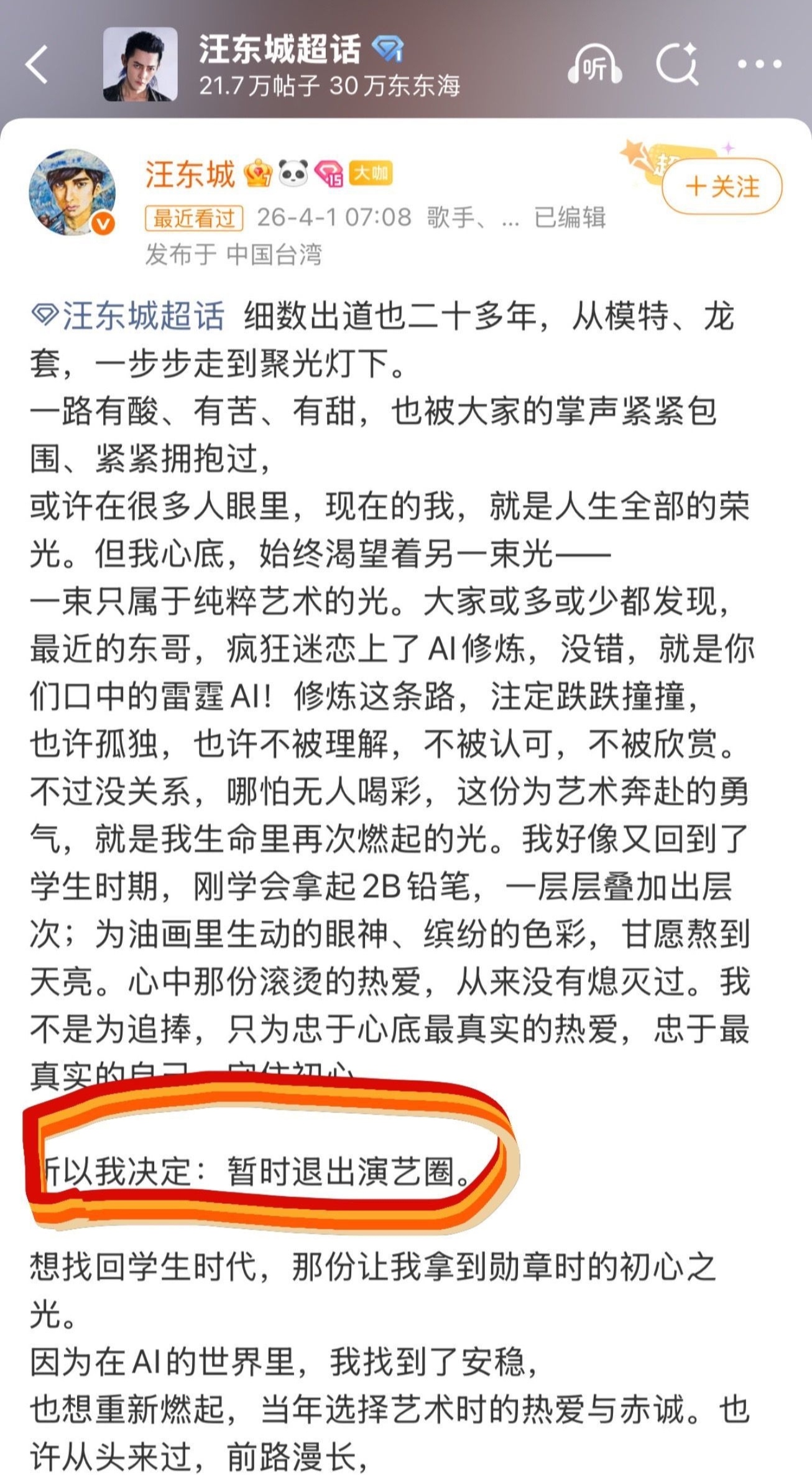 今年的"退圈宣言"显然升级了难度。不同于往年简短的几句话,汪东城这次祭出了长篇大论,从演艺生涯回顾到对未来的迷茫,从对粉丝的感谢到对行业的告别,文字真挚得几乎让人忘记日期的特殊性。正是这种以假乱真的叙事功力,让不少人在阅读过程中逐渐信以为真,甚至有人已经开始在评论区表达不舍与祝福。直到文末的反转出现,读者才惊觉自己又一次掉进了他精心设计的温柔陷阱。
