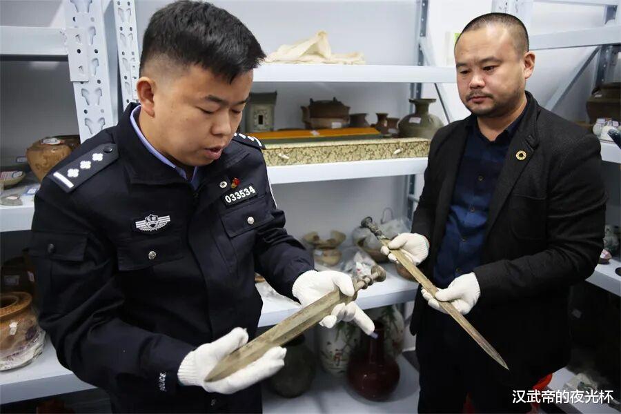 安徽安庆,潜山皖光苑,办案民警与潜山县博物馆副馆长李騊一起展示二级文物——战国时期镶青金石竹节把青铜古剑。张铮 摄