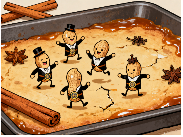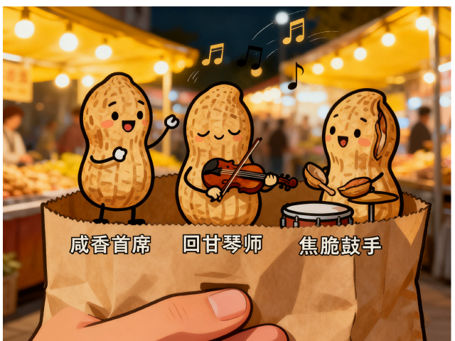 当肉桂棒打起节拍,花生团员们披上焦糖燕尾服,在烤盘上蹦跳着裂开笑脸,腰间别着茴香徽章,头顶花椒小帽摇摇晃晃。