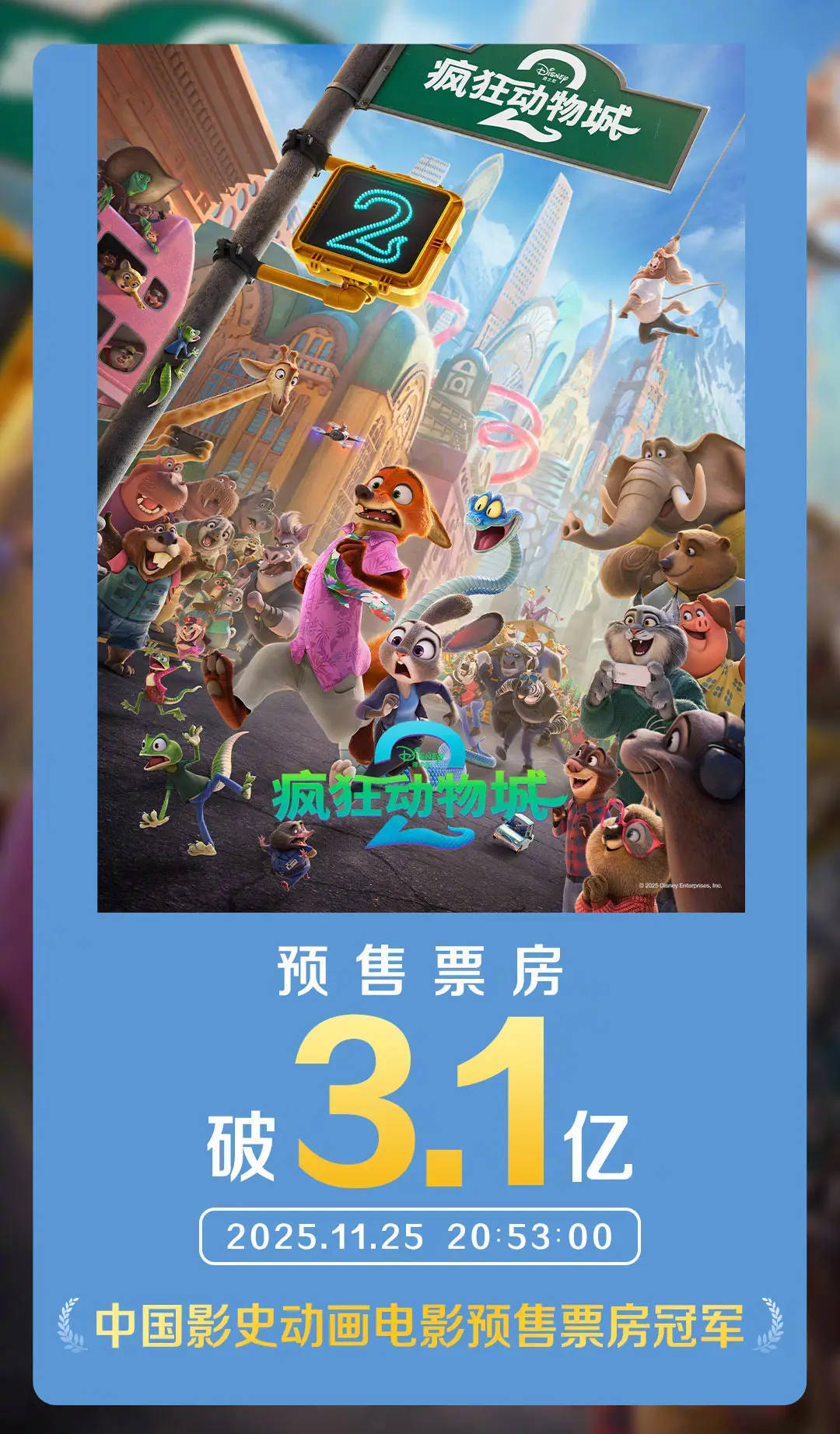 兔朱迪和狐尼克回来了!时隔九年,这对经典搭档再度携手征服中国观众。《疯狂动物城2》预售总票房已突破3.1亿元,刷新中国影史动画电影预售纪录,击败《哪吒之魔童闹海》登顶冠军宝座。