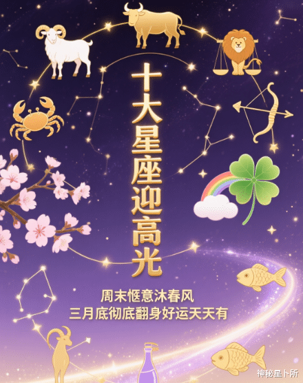 白羊座、金牛座、双子座、巨蟹座、狮子座、处女座、天秤座、射手座、摩羯座、水瓶座,这十大星座,各有锋芒,各有温柔,在三月底的转折点上,纷纷解锁好运模式,彻底翻身逆袭。曾经的焦虑与内耗,都被春风吹散;曾经的阻碍与不顺,都化为前行的力量,周末的闲暇时光,更是为这份好运增添了几分惬意与安心。