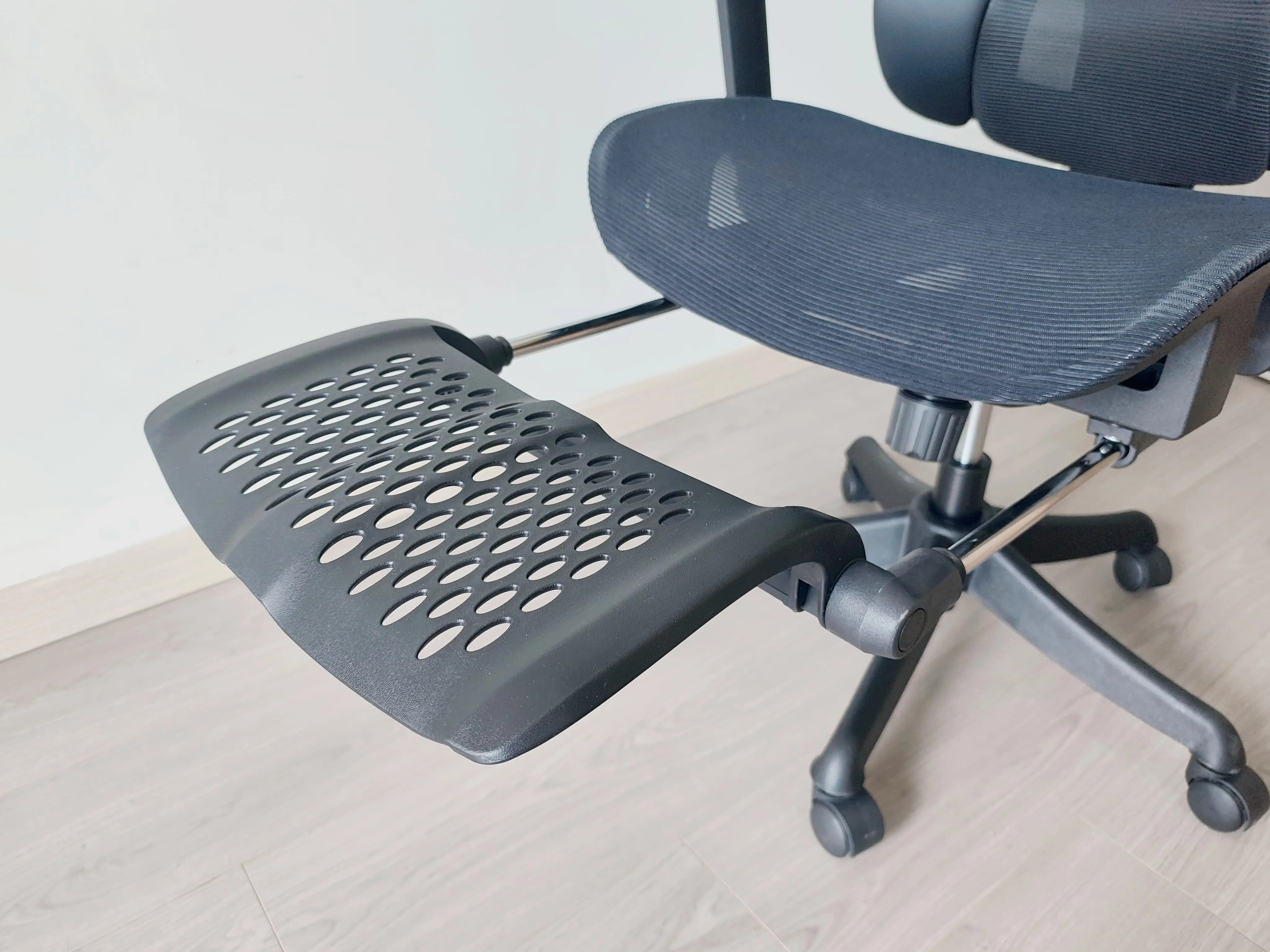 舒适度:坐感属于中性偏稳,不是那种一坐就很软的类型,但久坐后不容易累。扶手在打字时能托住手肘,肩膀负担会小一些。后仰配合脚托,午休时身体支撑比较完整。