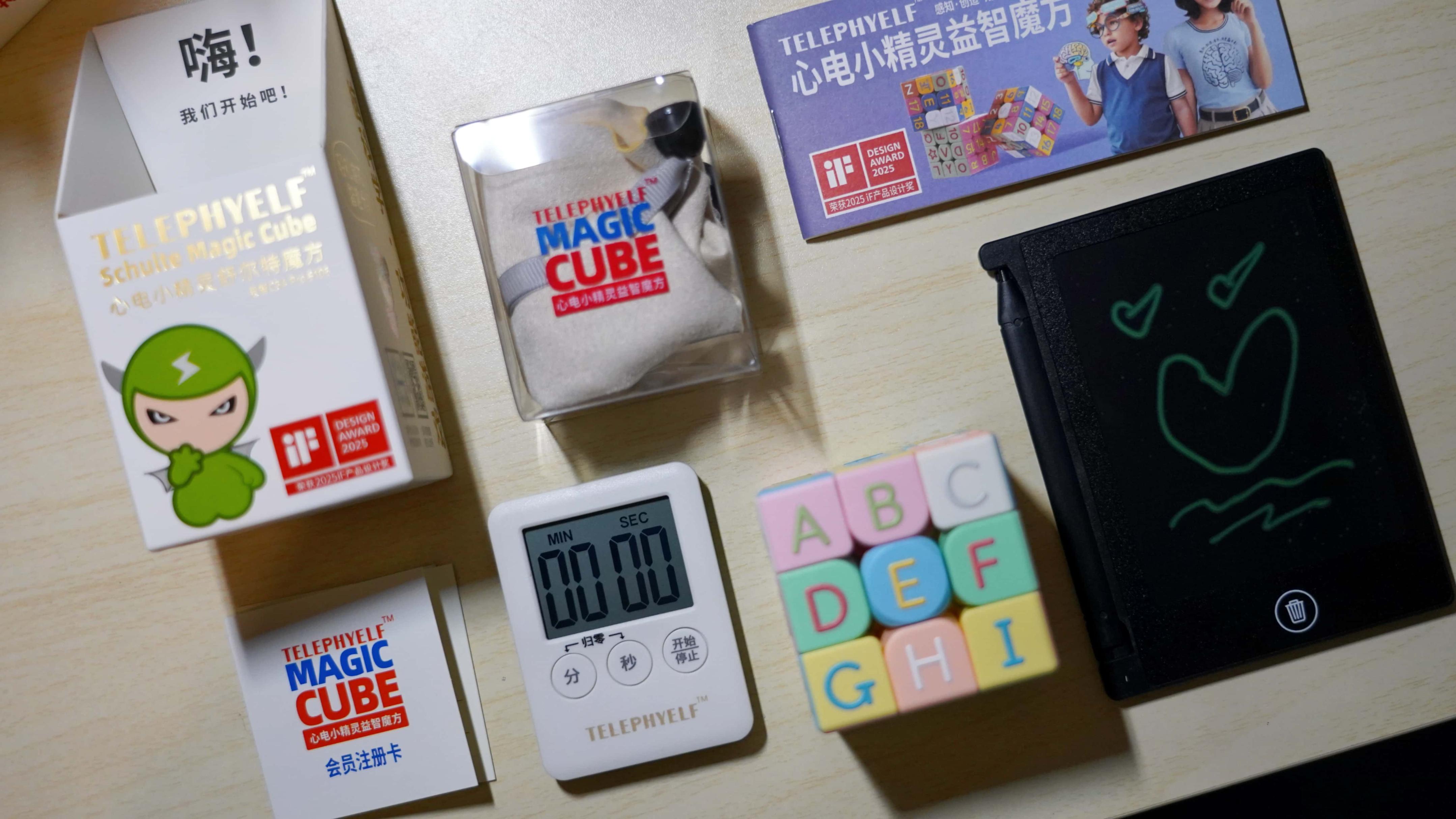 拆开包装,魔方内部还配有计时器,收纳袋,并且还送了一个小型手写板。