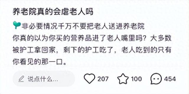 还有就是,一些人为了博取眼球,将道听途说的一些个例发布到社媒上,经过添油加醋的传播,一个负面事件就会演变成整个养老行业的“集体污点”。这些片面且情绪化的内容,在信息快速传播的网络时代,像病毒般扩散,不断加深大众对养老院的偏见,让养老院的污名化愈发严重。
