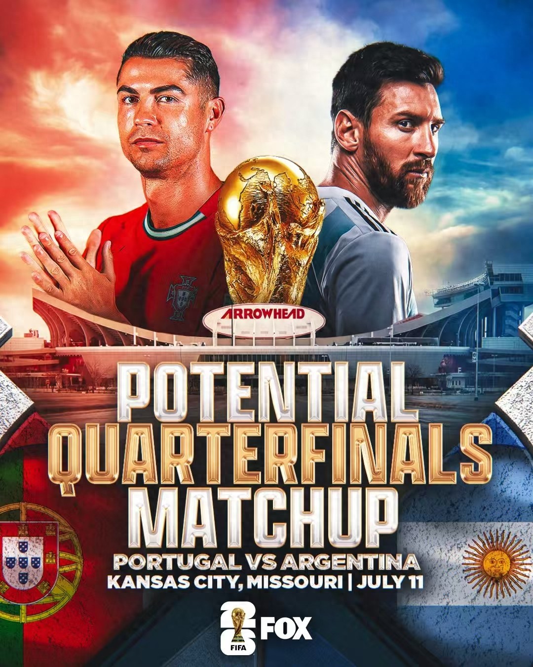 满足上述三大条件,2026世界杯梅罗对决就会开启。这样的话阿根廷和葡萄牙会在1/4决赛中相遇,梅西PKC罗。按照2026世界杯赛程,那么这场比赛会在北京时间2026年7月12日(周日)早上9时打响,比赛在堪萨斯城进行。