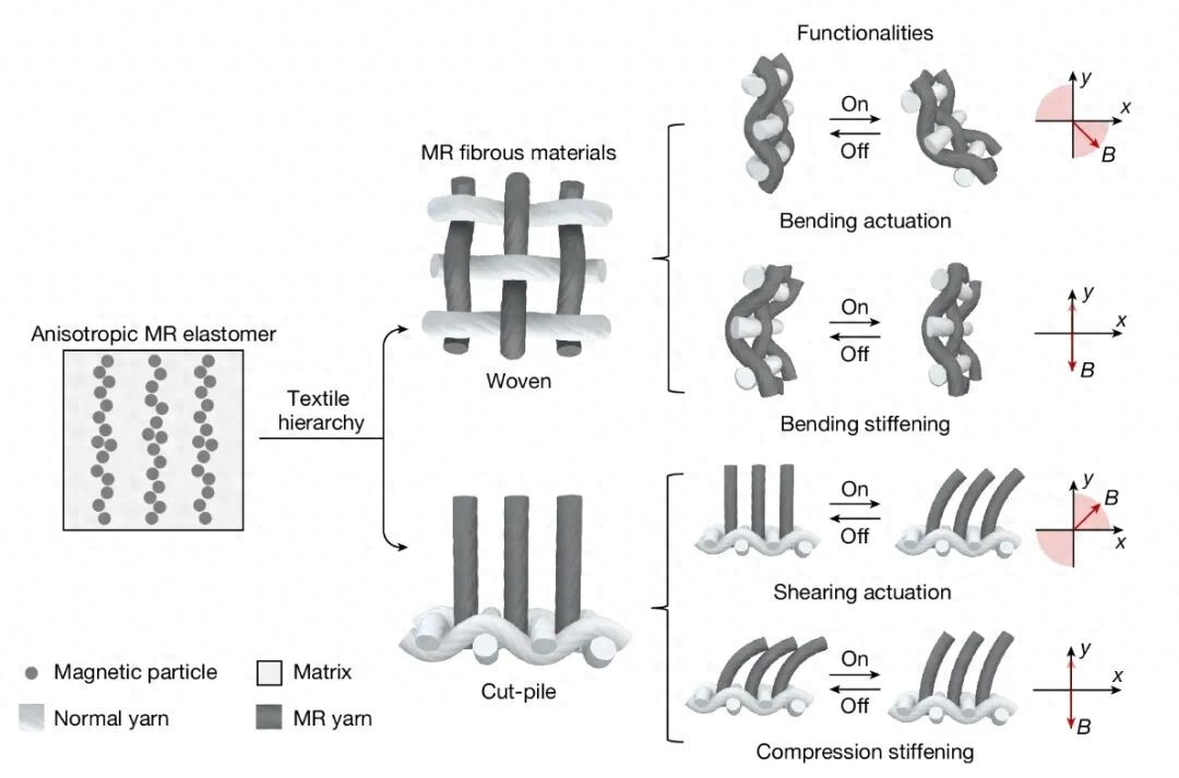 我们生活中常见的智能材料,大多能对温度、湿度、电压等“标量”做出反应,比如热胀冷缩、湿了变形。而“向量”是指带有方向的物理量,例如磁场的方向。这项研究的突破之处在于,纤维材料不仅能感知磁场的强弱,还能识别其方向,并做出对应的弯曲、拉伸或硬化动作。