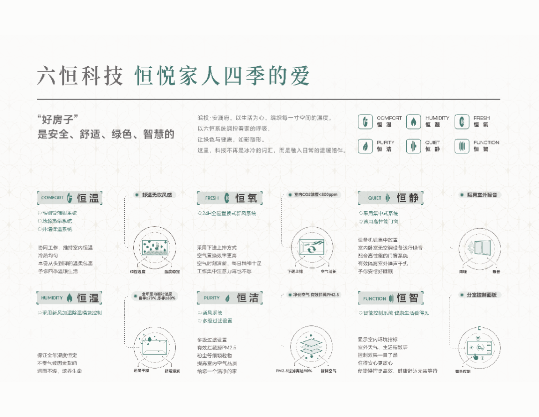 而皖投·安澜府引入北京金茂人居“科技人居整体解决方案”,真正将极度舒适的生活植入到了产品的基因中,营造出一个“恒温、恒湿、恒静、恒净、恒氧、恒智”的生活空间,极大提升居住舒适度。