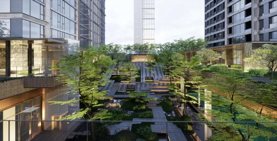 社区内部采用“两轴八景”的景观格局,结合“四进礼序”的空间序列,形成步移景异的视觉效果。项目绿化率高达40%,在有限土地中最大化绿植覆盖,营造宜居生态环境。