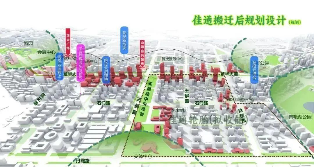 据悉,佳通轮胎厂搬迁后留下的大片空间,整体定位为明珠广场创新商务区,按照“两带一廊三组团”的空间结构来打造。(本规划内容为阶段性成果,具体以官方最终审批文件为准)