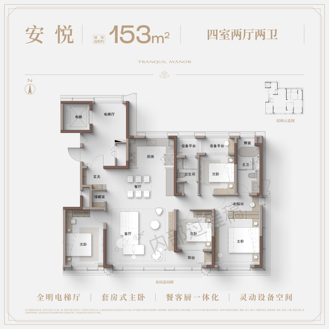 以建面约153㎡四室两厅户型为例,两梯两户的设计,自带私享电梯厅,兼具日常收纳储藏功能。