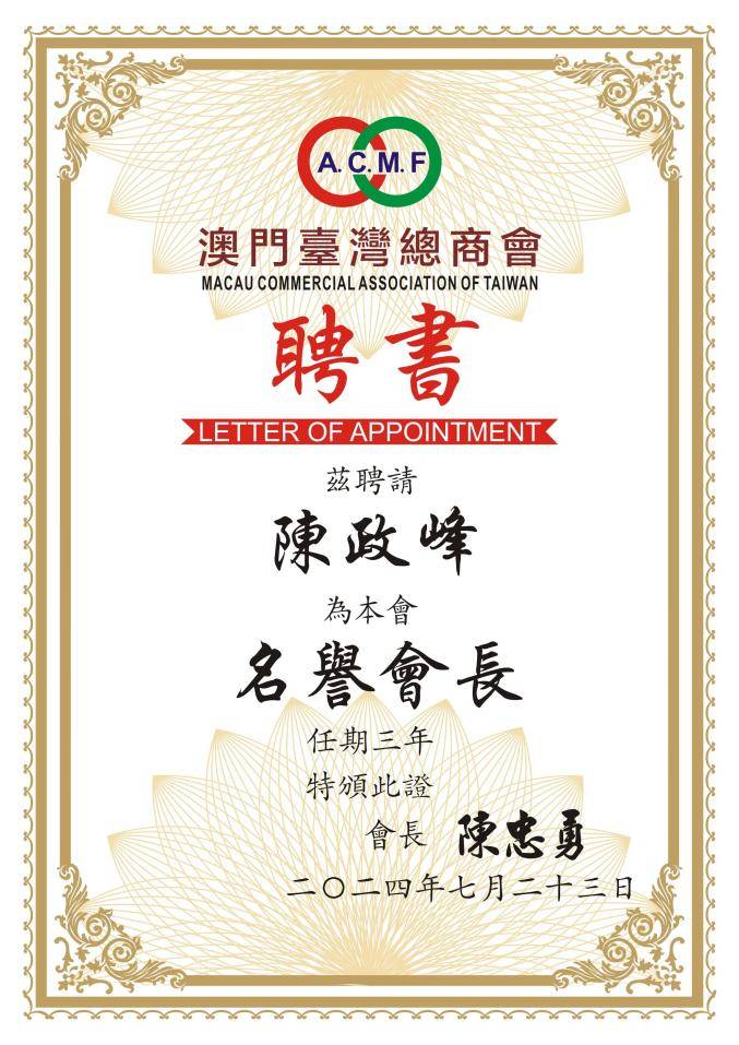 陈政峰此次出任澳门台湾总商会名誉会长,将成为连接澳门与台湾经贸合作的新纽带。凭借其在传媒、公益和文化交流领域的丰富经验,他将为两会发展带来新视野与新机遇。