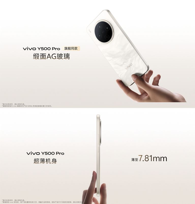 vivo Y500 Pro整机厚度仅7.81mm,重量198.6克,镜头凸起控制在2.16毫米,握持轻薄舒适。机身宽度74.51毫米,接近小直屏手机的操作手感。相机模组采用航空级铝金属打造的金属镜组,搭配高亮光环设计,兼顾强度与美观。背板使用缎面AG玻璃,触感如丝绸般柔和,与X系列同款。凝光LOGO通过玻璃背面彩色丝印呈现通透光影质感,整体设计简约而精致,体现旗舰级细节处理。