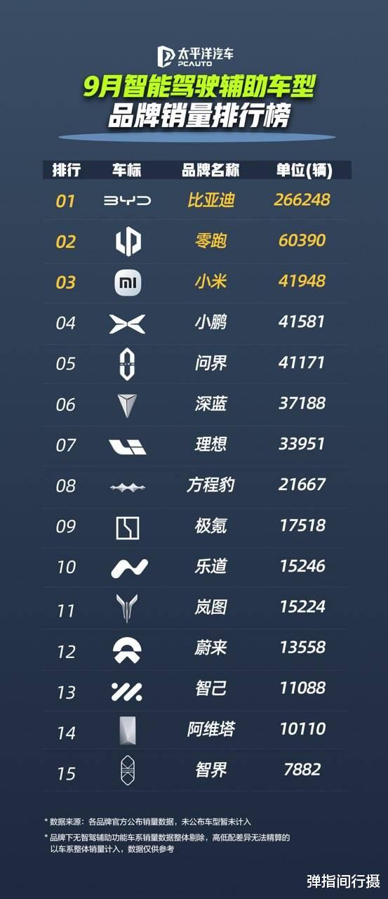 在太平洋汽车发布的9月智能驾驶辅助车型品牌销量榜中,比亚迪汽车荣登榜首,销量是第二名的4倍还多,优势断层领先,全维度领跑市场。