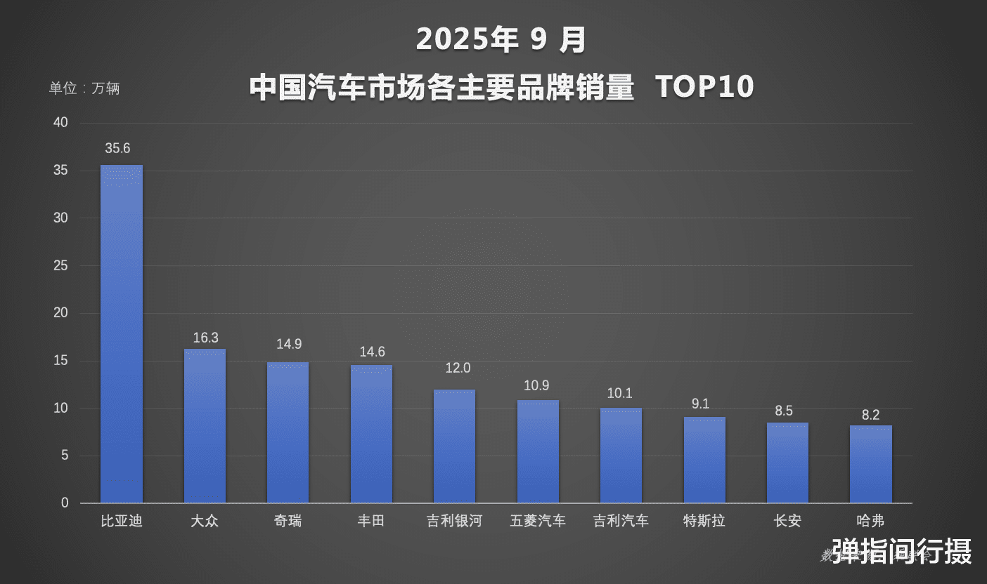 其中,比亚迪汽车(王朝丨海洋)品牌9月销量达35.6万辆,1–9月累计销量298.5万辆,在全市场单一品牌销量排名中稳居冠军,持续巩固头部地位。