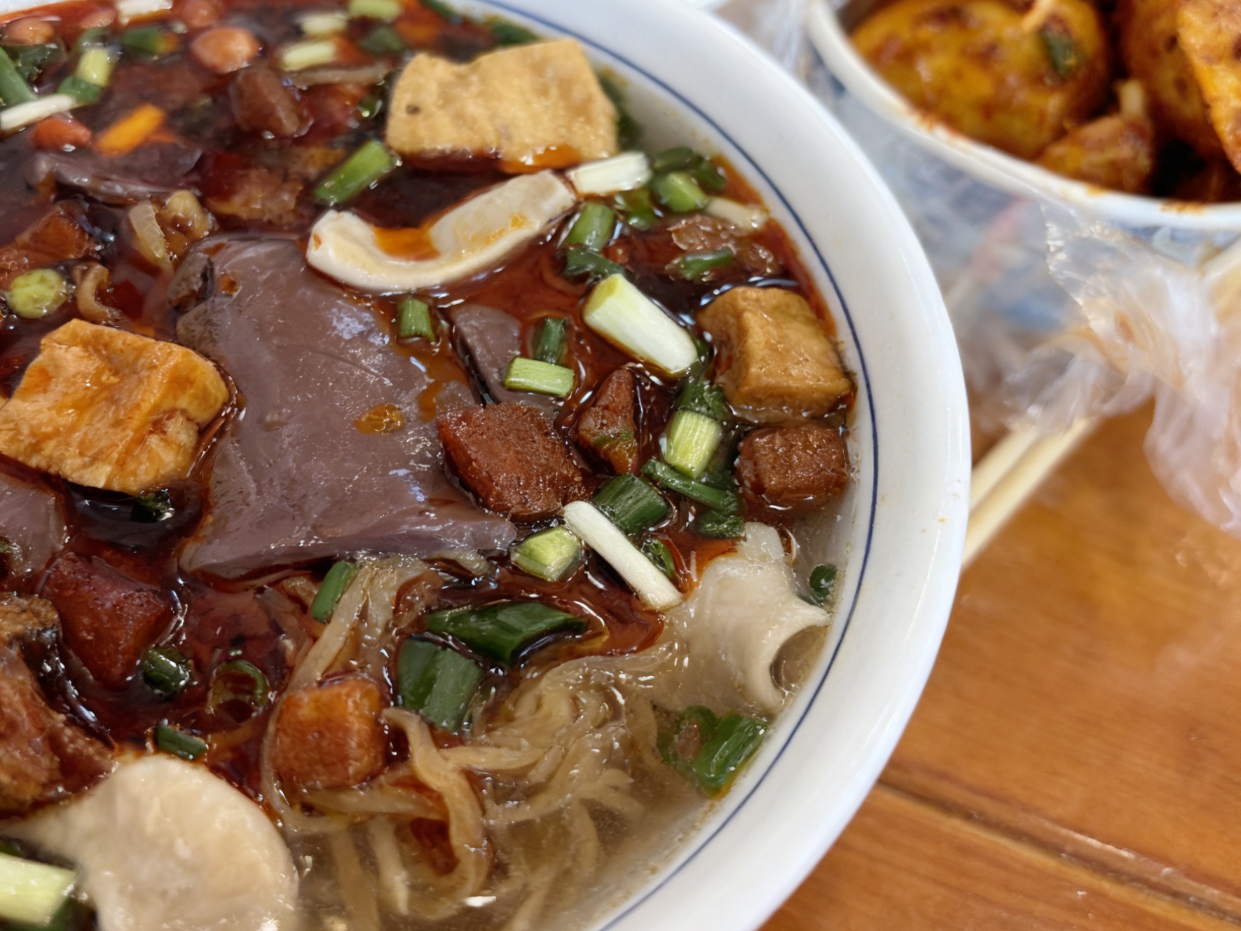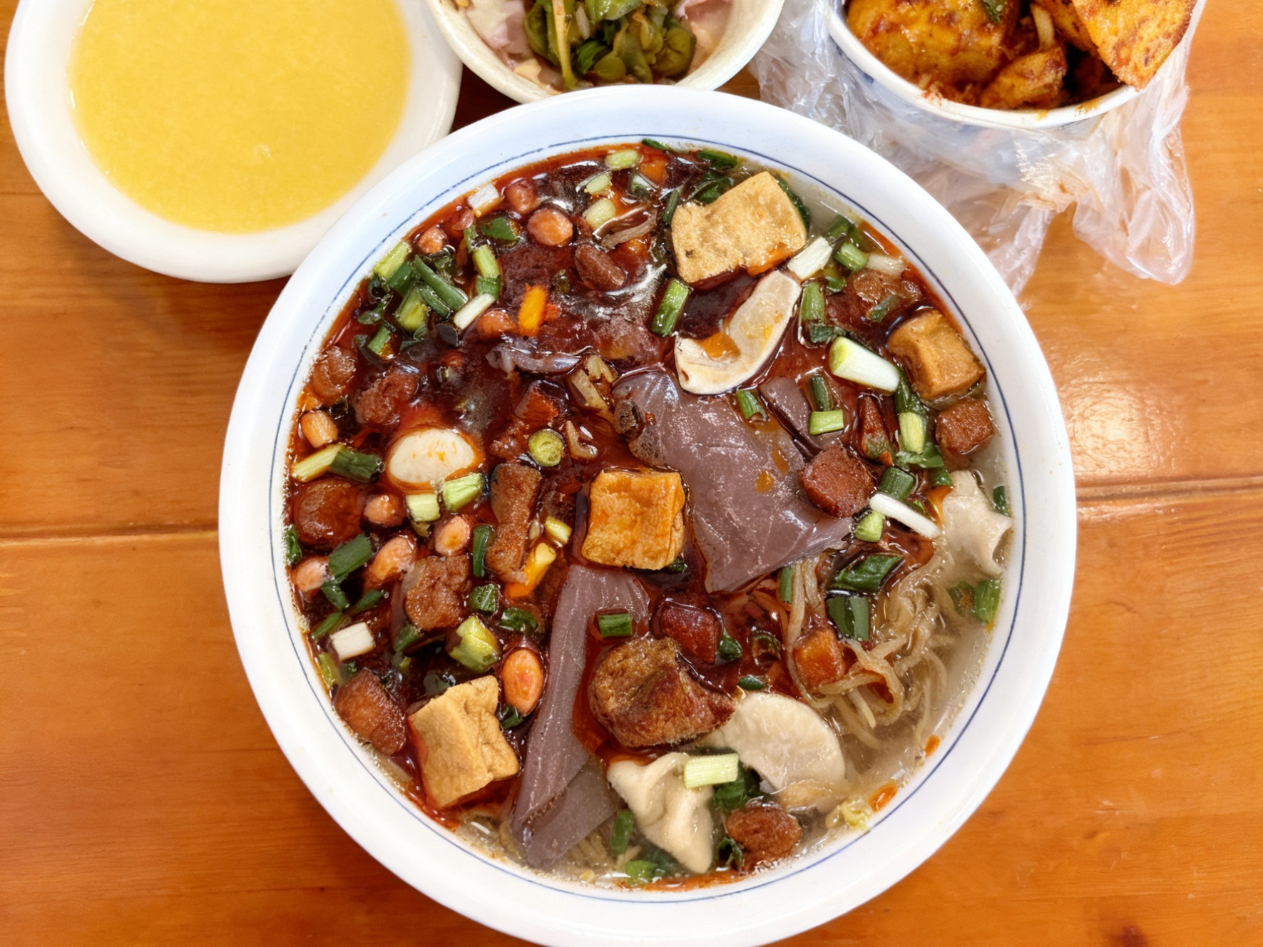 🍜手工制面口感脆韧,处理干净的肥肠耙耙糯糯,猪血嫩滑,脆哨干香。没吃过的朋友很难想象,一碗面能将看起来复杂油腻的食材,融合得如此清淡鲜香。