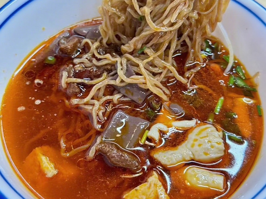 🐷别看肠旺面的汤看着油亮红润的,但其实味道一点也不油腻,只有微微辣度,增香提味正正好。