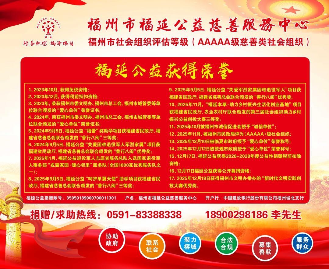 户名:福州市福延公益慈善服务中心开户行:中国建设银行股份有限公司福州城北支行