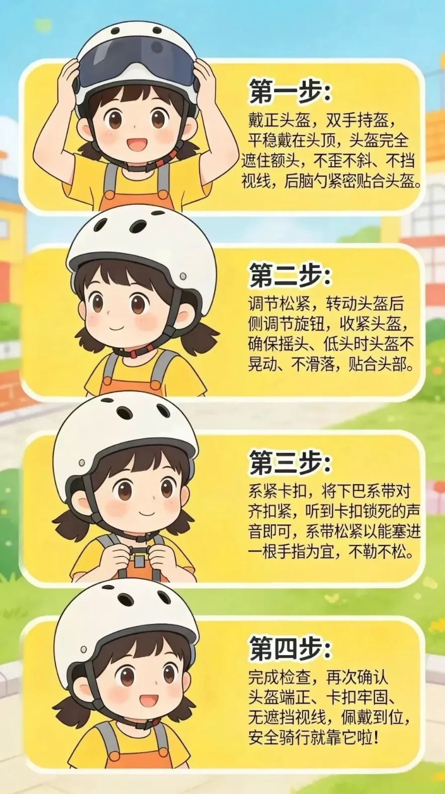 第一步:戴正头盔,双手持盔,平稳戴在头顶,头盔完全遮住额头,不歪不斜、不挡视线,后脑勺紧密贴合头盔。