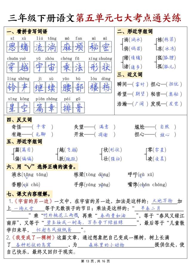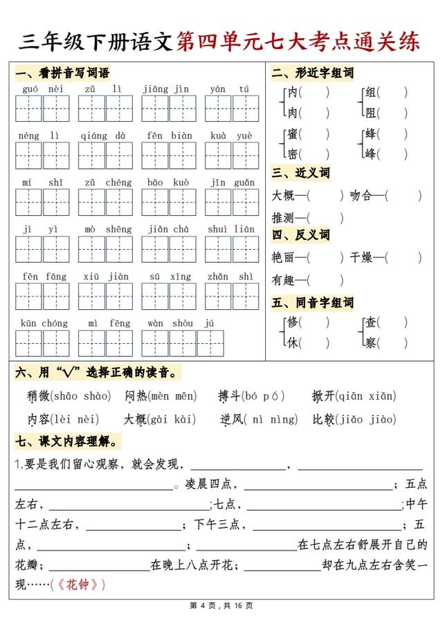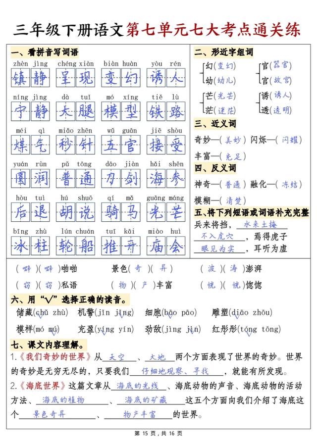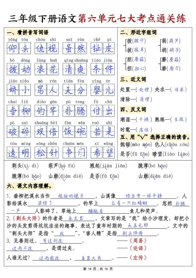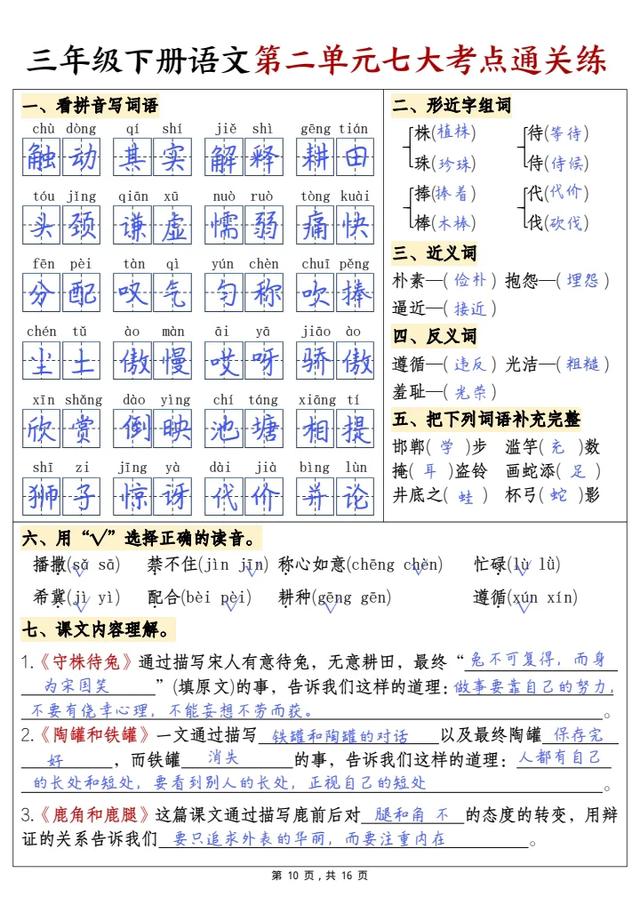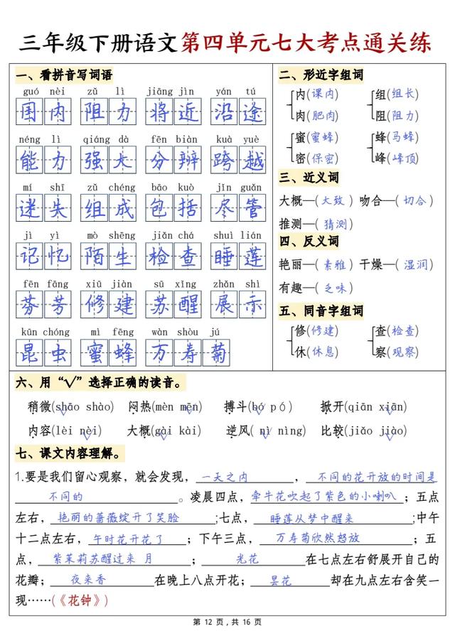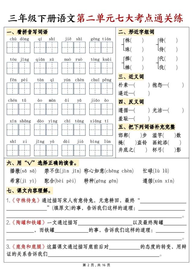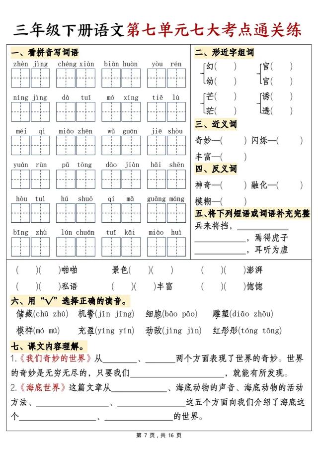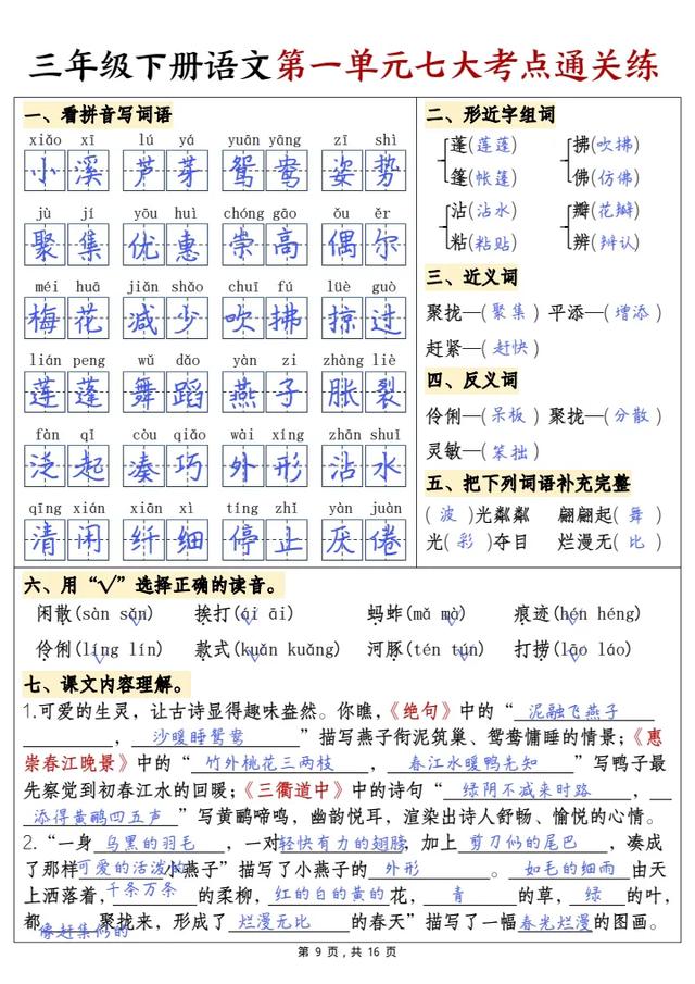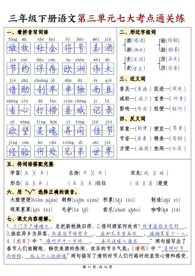 三年级下册语文,1-8单元考点通关练(含答案16页),收藏备用