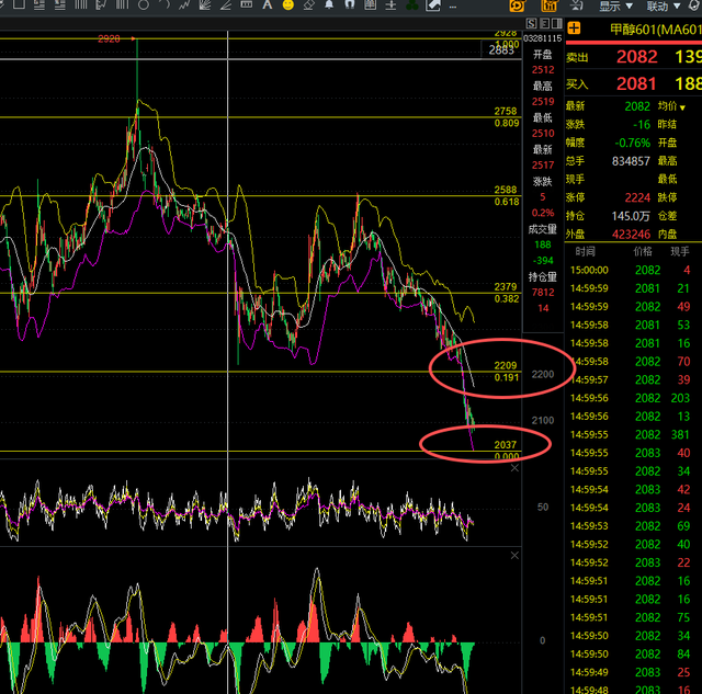 基本面:供应端: 开工率 84.63%(高位),周产量 199.21 万吨,同比 + 9.63 万吨,供应持续过剩,需求端: MTO 开工率 87.82%(稳定),但传统下游醋酸、甲醛等开工率偏低,需求提振有限,库存压力: 港口库存 128.61 万吨,同比 + 25.18 万吨,内陆库存 38.65 万吨,均处历史高位,关键变量: 12 月气头装置或因限气减产(支撑);11 月 MTO 装置检修计划(压制)技术面:日线:震荡下行,5/10/20 日均线空头排列,MACD 绿柱增长,RSI (14) 接近超卖 (30 附近),关键支撑:2070 元(日内低点)→ 2050 元(近期平台)→ 2030 元(强支撑),关键压力:2100 元(心理关口 + 前日收盘)→ 2110 元(日内高点)→ 2120 元(压力区),形态:下降通道中运行,短期超跌反弹可能,但整体弱势难改