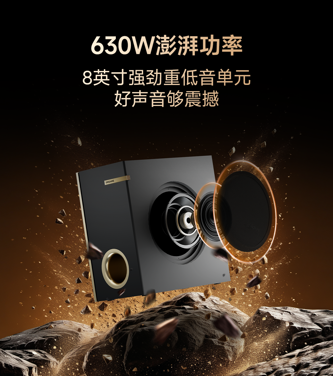 Pano S2基于5.1.2杜比全景声架构构建,集成12个扬声器单元与无线后置环绕音响,结合630W峰值功率与8英寸大箱体低音炮,共同营造出极具包围感与力量感的声场体验。经由大师调音与追觅臻声实验室反复淬炼,其声音风格精准还原创作意图,细节表现力尤为出众。