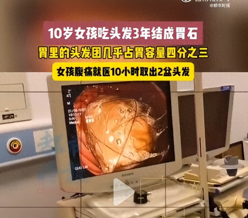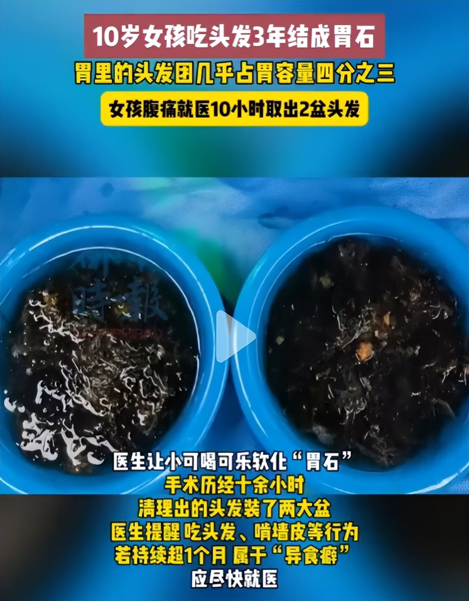 这是由于小可在3-4年前就有了吃头发的习惯,但吃了大量的头发后,由于头发是由角蛋白组成的,并不能消化,也很难通过肠道排出,然后它们在胃酸的作用下发生了变性,和其他胃里的东西形成了块状,时间长了就变成了坚硬的胃石,真是让人看得头皮发麻呀。