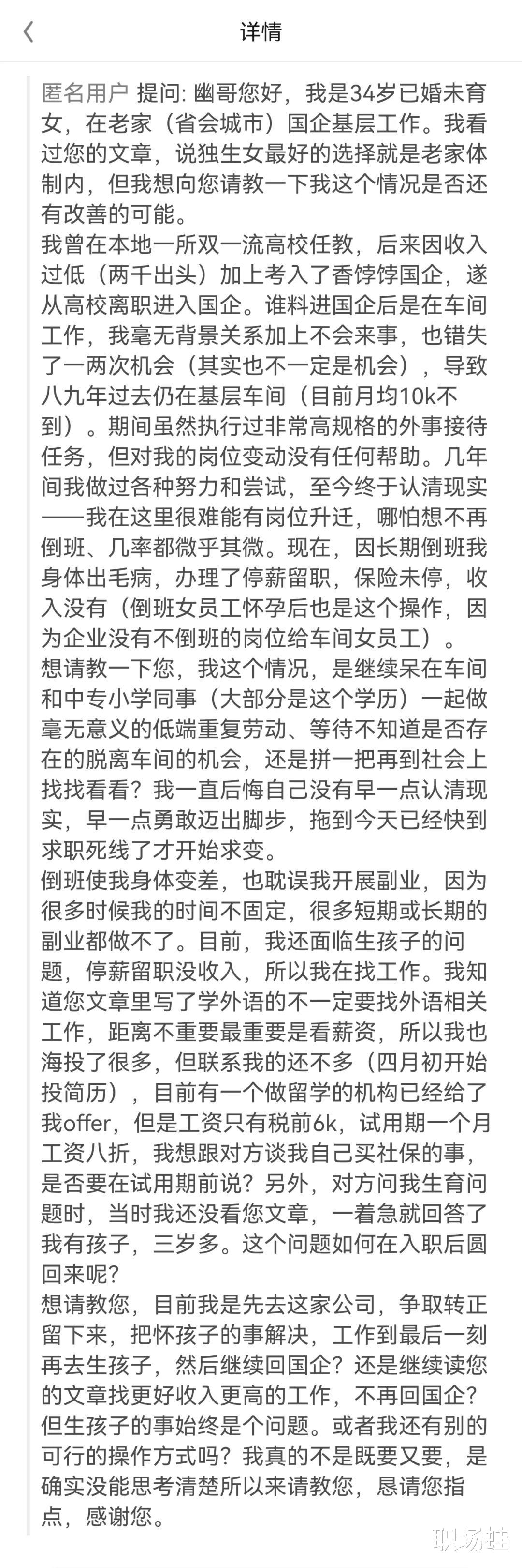 “幽哥您好,我是34岁已婚未育女,在老家(省会城市)国企基层工作。”