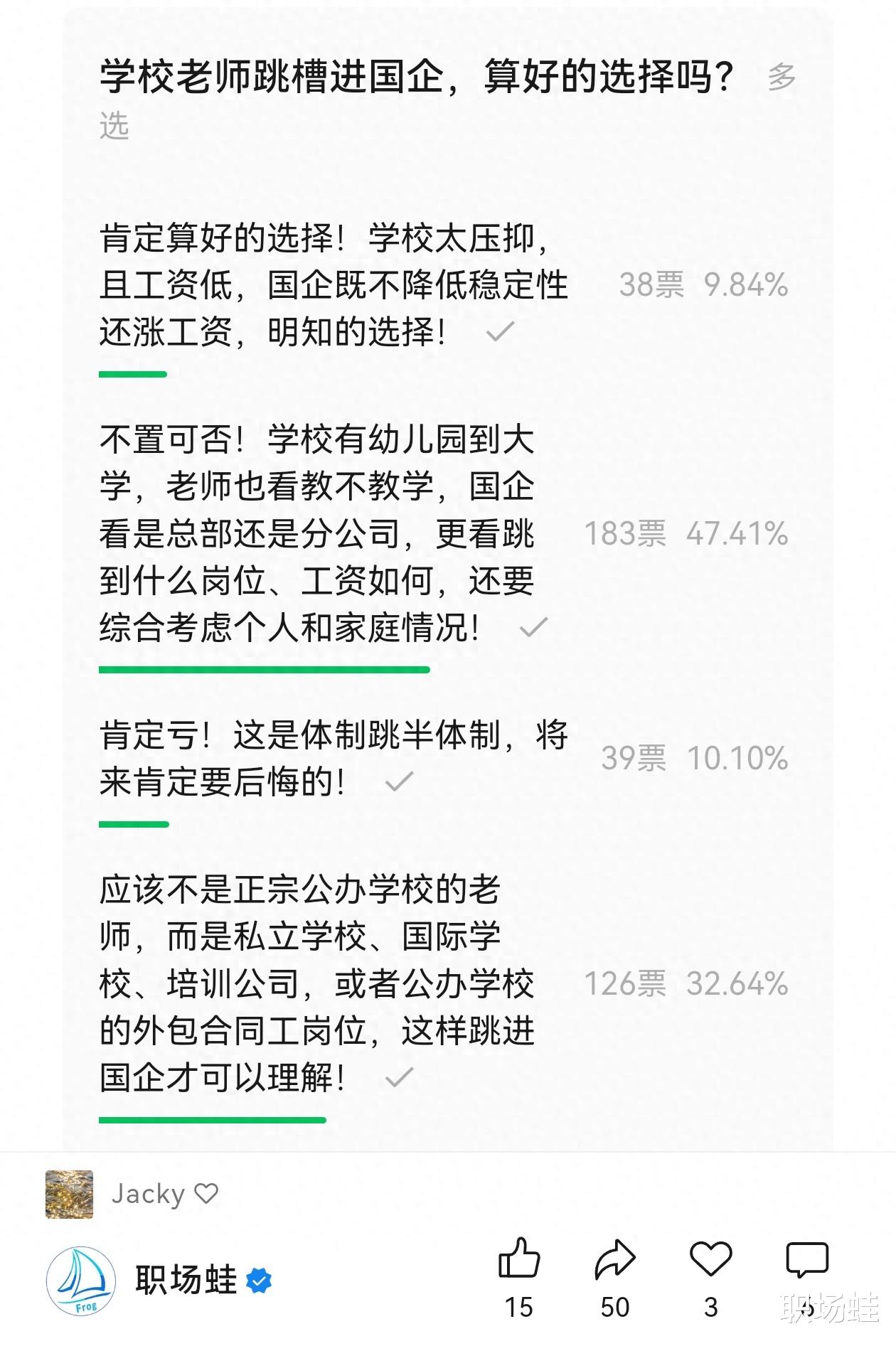 我们这就做个调查,你觉得:学校老师跳槽进国企,算好的选择吗?