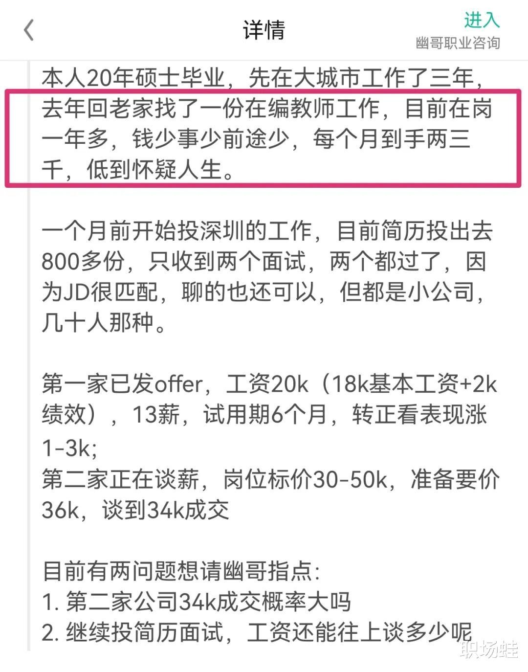 不过无论如何,你当初毕业后1-2年时,从最低学历硕士的水平、第一年月薪税前不足3000的工资、河南大学这样的双一流高校的教师岗位上,跳槽进了郑州的一家国企。工资可以谈一谈,一定不能太低,否则就亏大了。