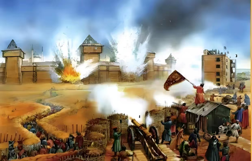 一年之后,双方都做好了准备,大战一触在即。沙俄部队认为自己的火力优势很大,就采取了出城野战的策略,以阻挡清军红衣大炮接近城下,一时之间,枪炮齐鸣,清军以大量火炮压制沙俄火炮,俄国士兵就只好退回城中。看到城外的罗刹人被打回去之后,水师舰队行至上游,截断了沙俄从尼布楚到雅克萨的增援通道,陆军则把雅克萨城市团团围住。由于城墙太过坚固,清军久攻不克,众将决定在城外筑高台炮楼,居高临下轰击城内守军。这么一来,沙俄士兵就只能出城野战,统帅托尔布津也战死城下。
