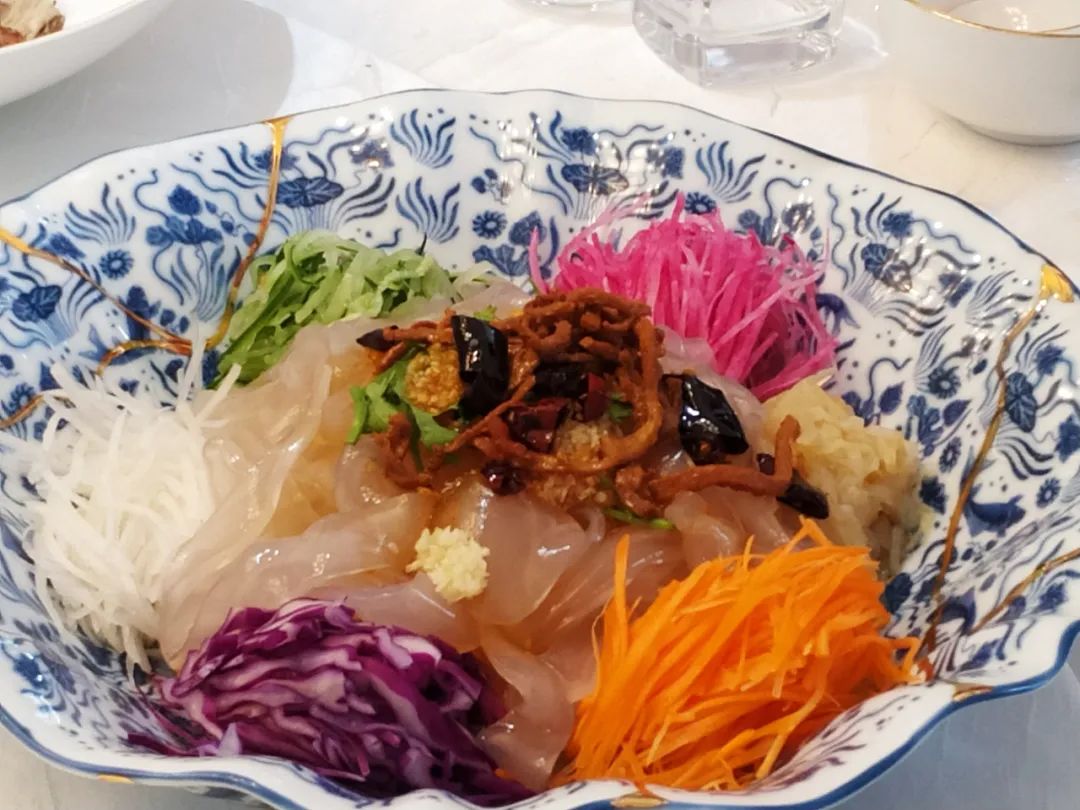 新鲜现制的拉皮搭配着橙黄色胡萝卜丝、红色和白色的萝卜丝、绿的黄瓜丝、紫色甘蓝丝,再配上肉沫,和厚厚的芝麻酱。好看又好吃。