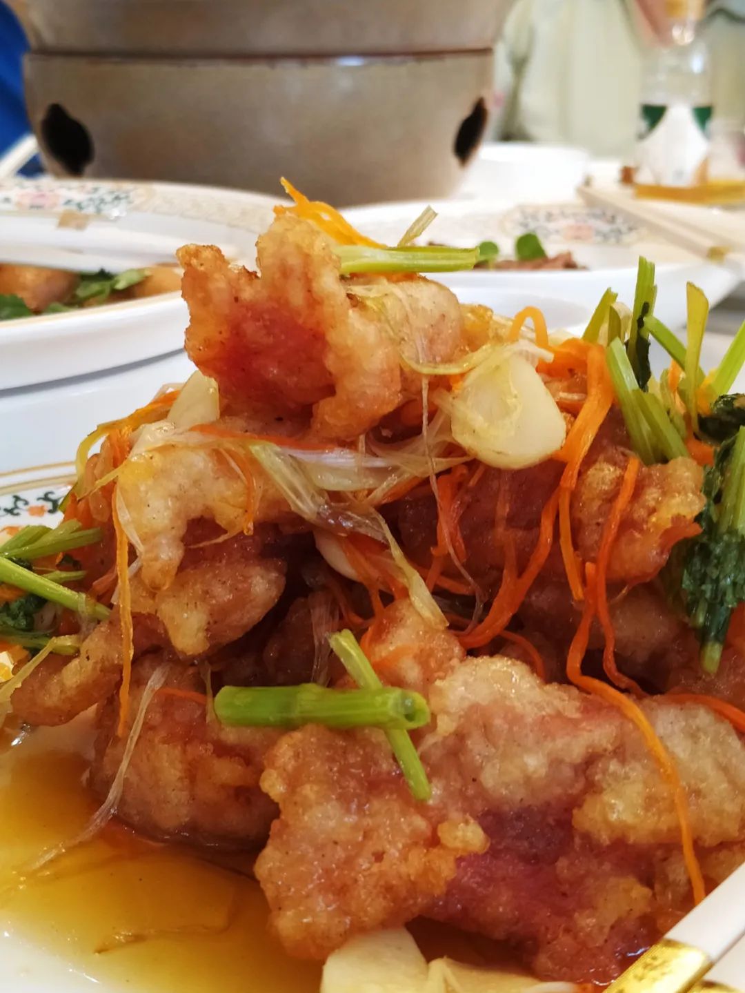 复炸三遍的锅包肉,十分的酥脆,咬下去“嘎嘣”一声响,烹汁的酸度够猛,带着哈尔滨锅包肉特有的“窜鼻子”的醋香,十分像样。