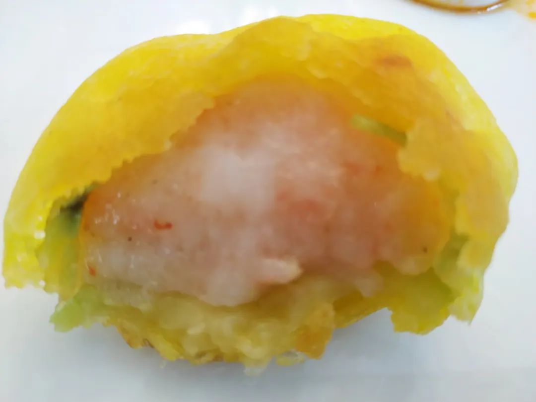 不过,这里做了改良和升级。把油炸改成煎,内馅也变成了虾肉,茄子去了黑色的外皮。
