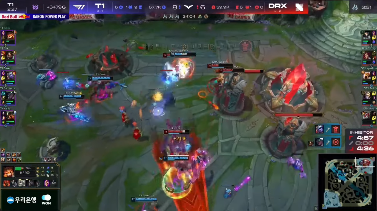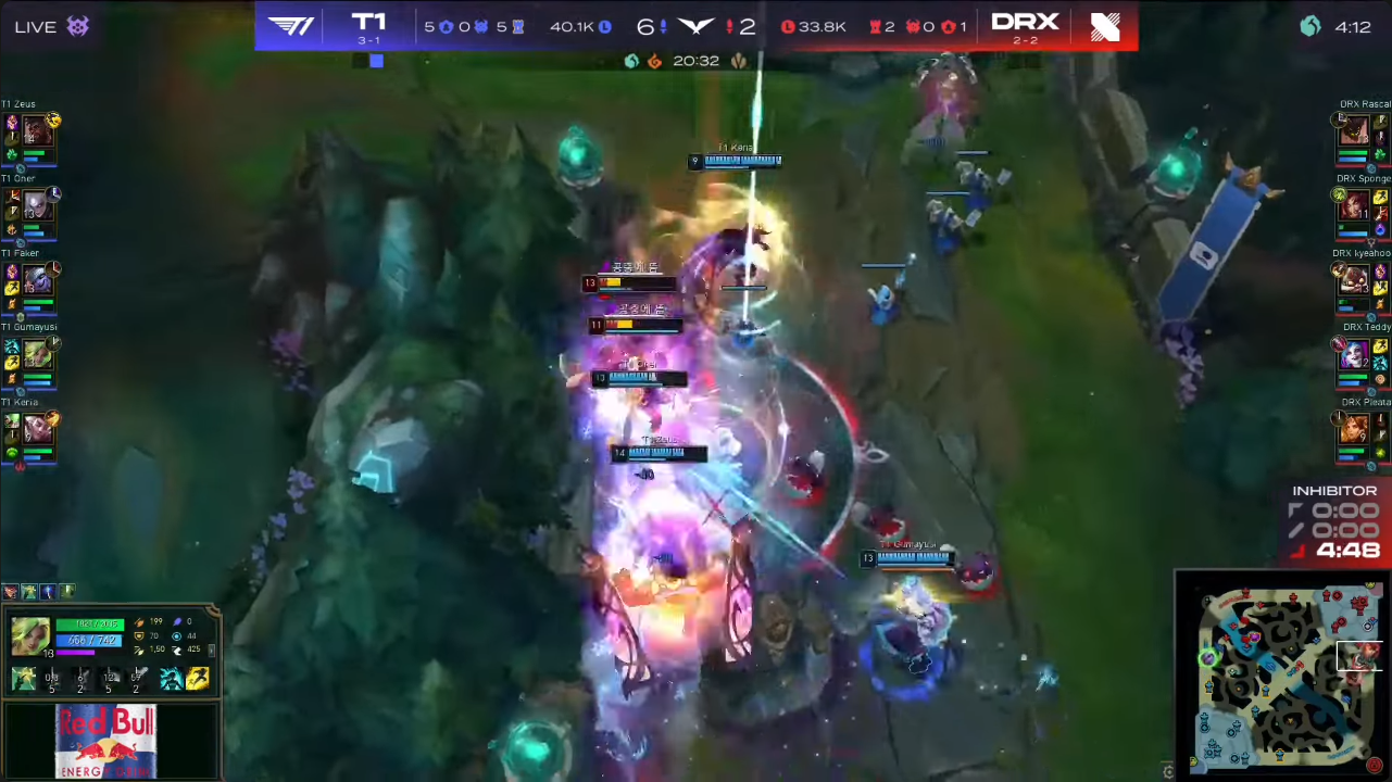 双方的首局比赛,T1在对线期取得了一些小优势,但节奏并没有想象中那么顺利,中期Gumayusi因为走位失误被逮住,DRX顺势抱团拿拿下大龙并手握3K优势,后续zeus纳尔单带成功破高,在之后第二条的大龙争夺中,DRX蝎子被zeus纳尔牵制,T1成功拿下大龙后又抓掉婕拉,携带大龙buff,T1上辅为队友争取到了输出空间,一波拿下首局。