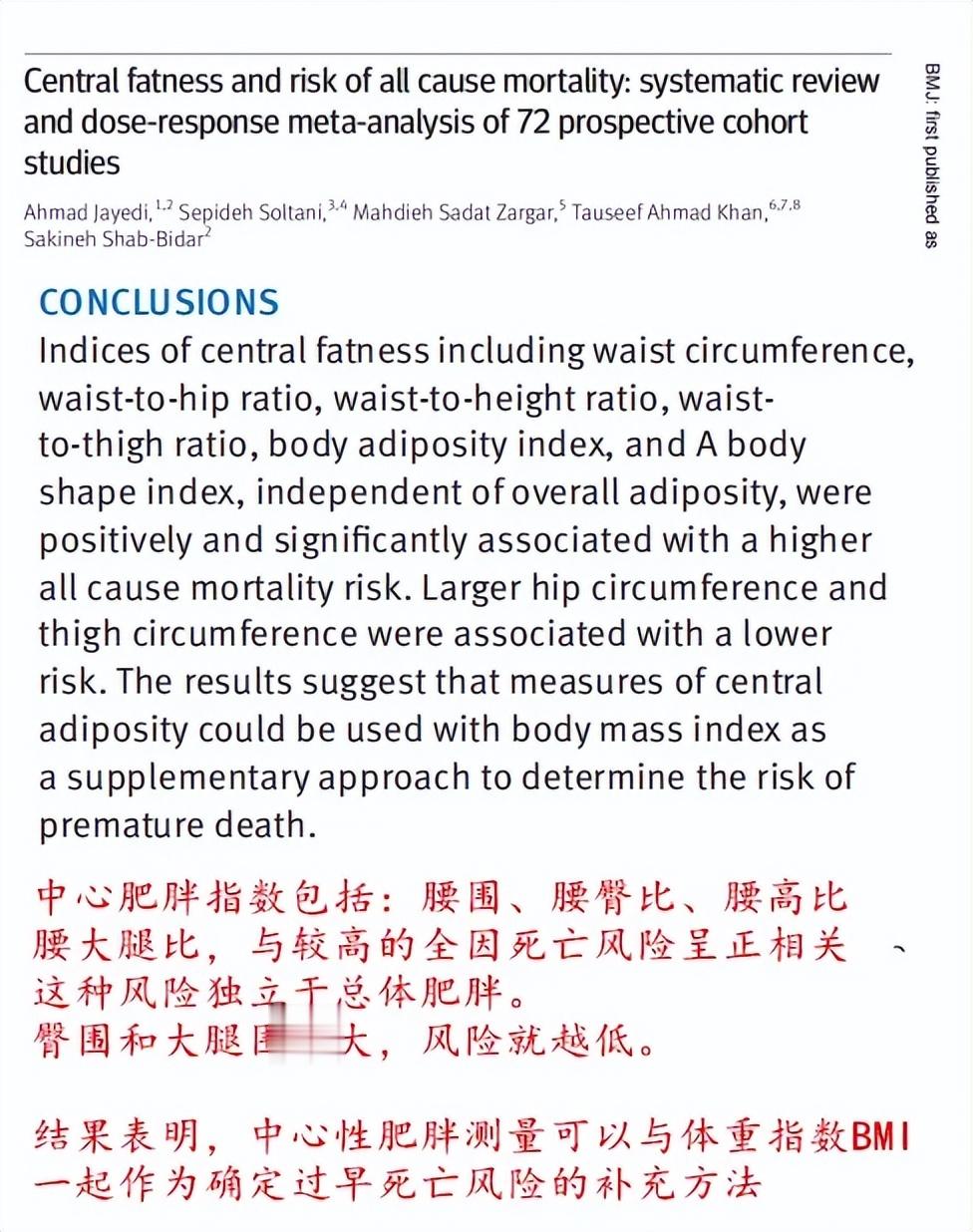 2020年医学顶刊BMJ发表一篇研究,分析了中心性肥胖,大腿周长和死亡风险的关系[2]。结果显示: