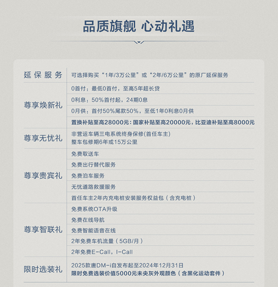 此次2025款唐DM-i共推出4款车型,售价17.98万~20.78万元。同时,比亚迪为用户准备了包括“尊享焕新礼、尊享无忧礼、尊享贵宾礼、尊享智联礼、限时选装礼、延保服务”六重购车礼遇。