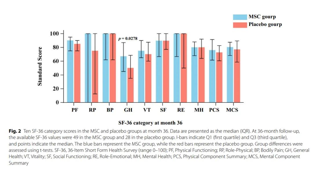 研究洞察:这项随机、双盲、安慰剂对照的临床试验显示,脐带来源MSCs组患者肺损伤修复加速,46.94%的患者在三年后肺部CT影像完全正常,显著高于安慰剂组的34.48%。MSCs组的生活质量评分(SF-36中的“总体健康”评分)也显著优于安慰剂组。