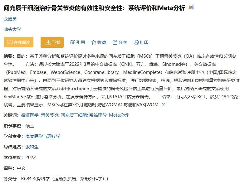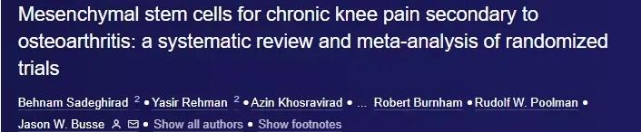 此外,另一项针对25项随机对照试验(涉及1494名受试者)的Meta分析表明,MSCs可在第3个月随访时减轻WOMAC疼痛和VAS评分,效果持续至少12个月。