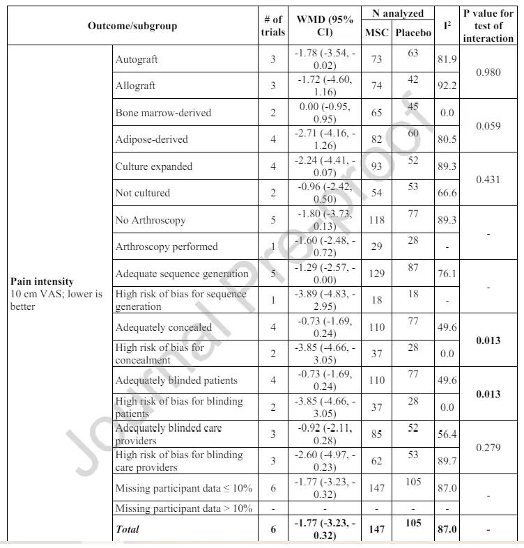 研究洞察:分析结果显示,与对照组相比,MSCs治疗在短期(3-6个月)内能减轻疼痛,平均差(WMD)为-0.74厘米(在10厘米视觉模拟疼痛评分尺上)。