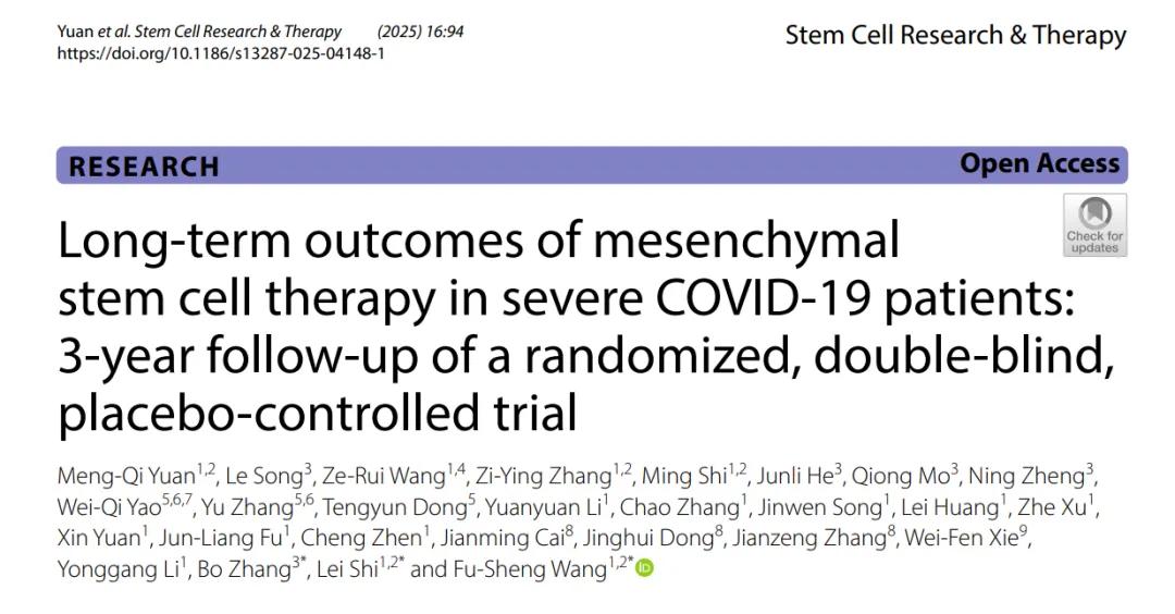 王福生院士团队在《Stem Cell Research & Therapy》 上发表了关于间充质干细胞干预重症新冠患者的三年长期随访结果。