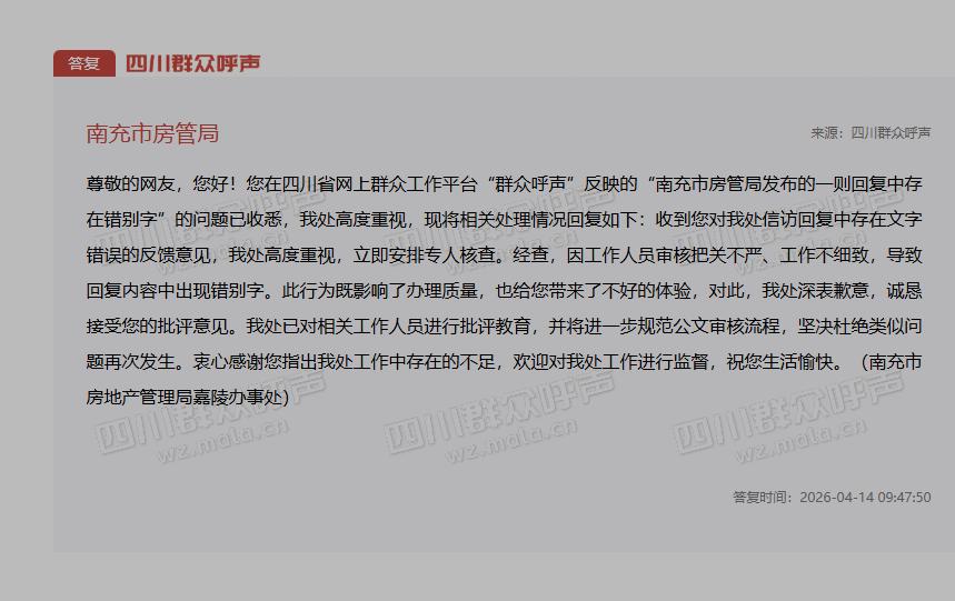 尊敬的网友,您好!您在四川省网上群众工作平台“群众呼声”反映的“南充市房管局发布的一则回复中存在错别字”的问题已收悉,我处高度重视,现将相关处理情况回复如下:收到您对我处信访回复中存在文字错误的反馈意见,我处高度重视,立即安排专人核查。