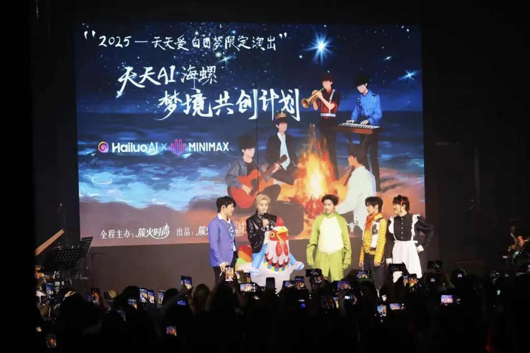 《青春有你3》天天组的五位成员举行了一场名为“天天爱白日梦”的限定演出,而这场演出的大屏视觉素材,涵盖主海报、开场视频及各曲目配套动画,均由海螺AI生成,呈现出的依然是成熟、统一的舞台体验。但真正让粉丝们沸腾的,是互动方式的升级。粉丝们以艺人形象创作出的相关短视频,有机会登上大屏播放,甚至被艺人模仿。