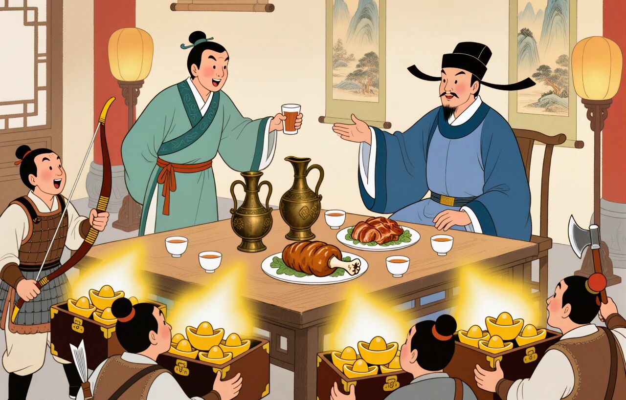 席间,客商命随从当众打开那四个箱笼,顿时金光四射,满箱的金锭看得众人目瞪口呆。