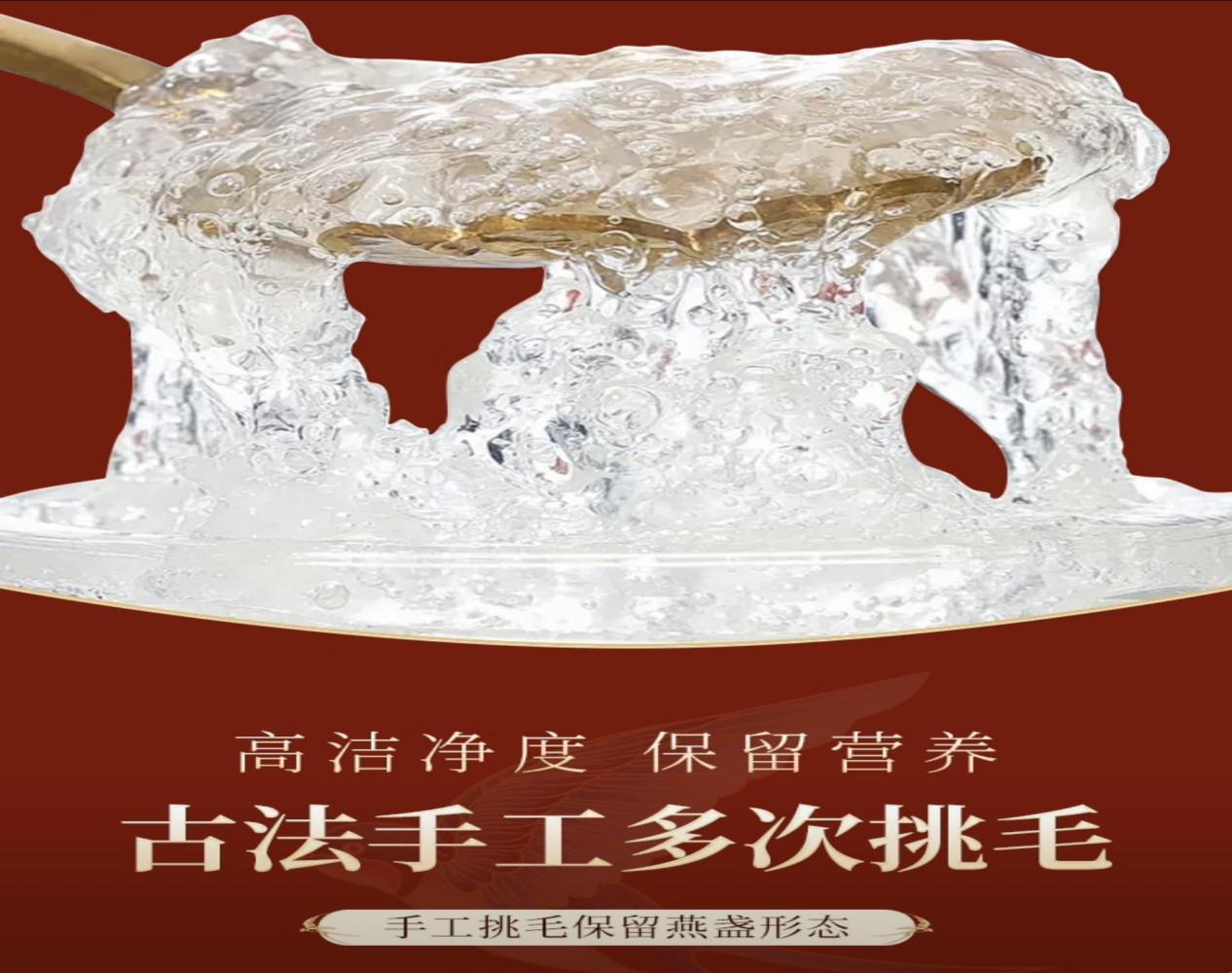 同仁堂延续老字号一贯的稳健作风,将流程规范与长期可控作为核心追求。原料选自管理体系成熟的马来西亚合作燕屋,采收时间、环境条件、批次记录完整可查,供应链透明度高。加工环节注重保留燕窝原生状态,挑毛精细却不过度修形,在洁净度与盏形完整度之间找到最佳平衡。成盏饱满自然,纤维纹理清晰,干度稳定,整体风格低调务实,更适合看重安全感与长期稳定性的消费者。长期食用中,口感与结构波动极小,是稳健型人群的安心之选。