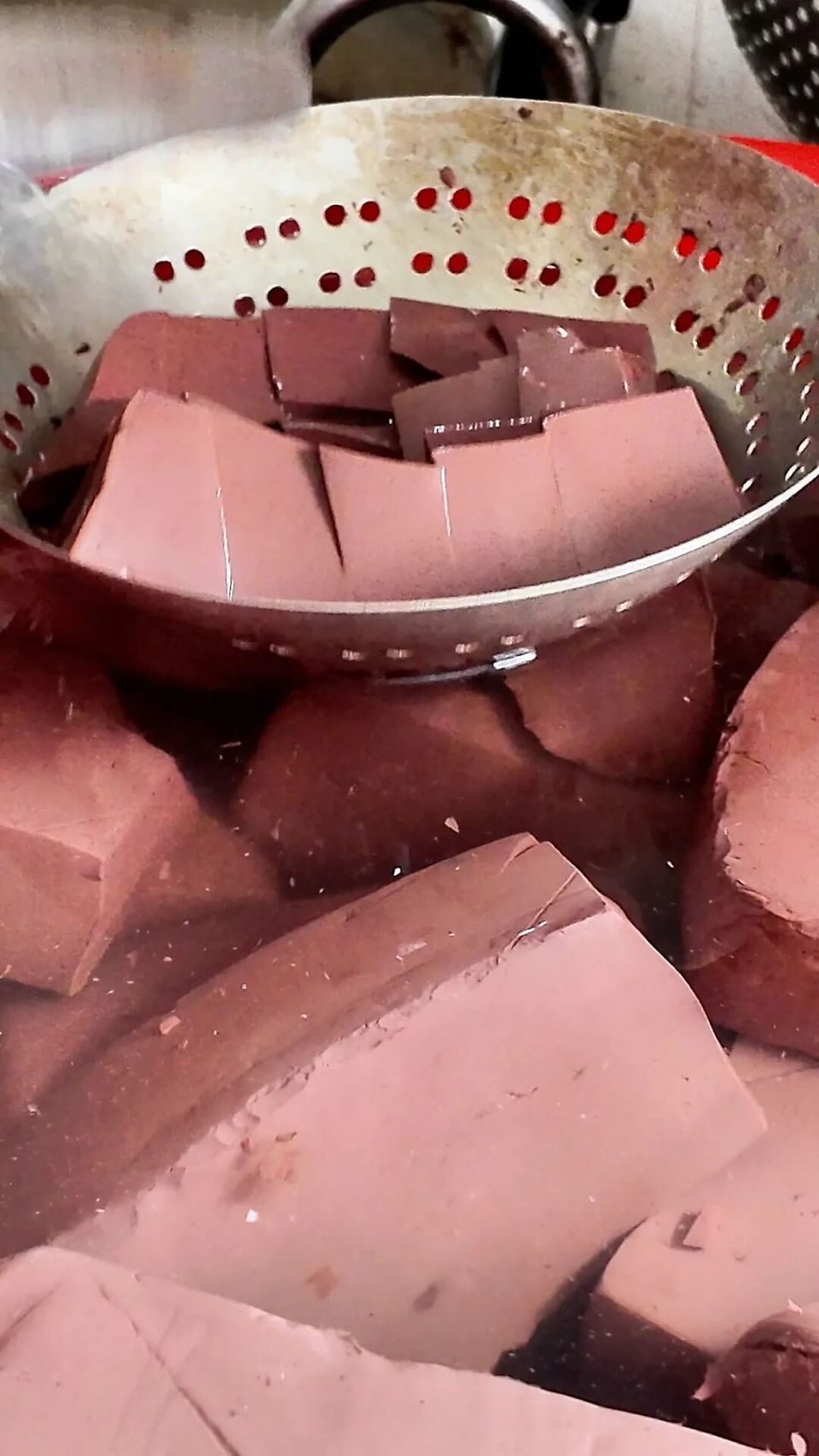 一碗上乘的猪红汤,选材是关键。为了保证品质,珍姐每天都会专程前往生鲜屠场采购猪血。从生血到成品,十余道手工工序环环相扣,容不得半点马虎。猪血先经过多轮过滤,去除杂质后冲洗干净,静置一个多小时自然凝固;凝固成型后入锅煮熟,再放入汤中慢浸两三个小时;捞出后还需细心修整,切去带气泡的部分,再用清水冲洗干净,确保每一块猪红都质地均匀、口感细腻。