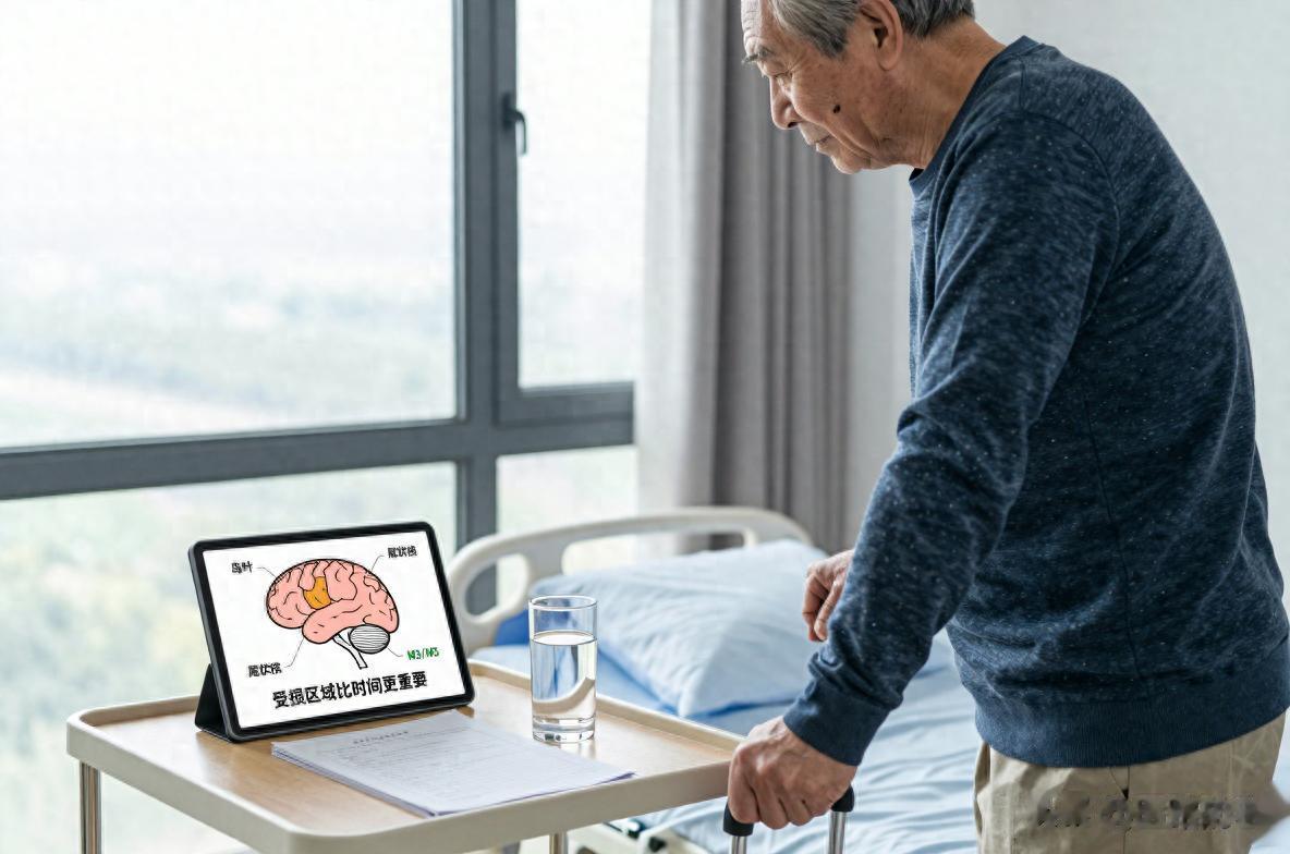 岛叶 (Insula): 它是大脑的“隱藏中心”。由于它的血液供应全靠深层分支,缺乏侧支循环的“救助”,一旦缺血极易坏死 。它负责调节植物神经、感觉处理和认知。岛叶坏了,不仅影响意识,还可能引发心脏心律失常等并发症 。尾状核 (Caudate Nucleus): 这里是大脑的“运动和智力枢纽”。它非常耗能,对缺氧极其敏感 。即便血管通了,这里一旦发生坏死往往不可逆,直接影响患者后续的行走和思考能力 。M6区域: 位于大脑皮层的顶部。这里的损伤在早期窗口期被证实是预后差的独立预测因素 。科普知识点: 如果您的家属在发病早期入院,即便评分看起来还可以,但如果上面三个区域有亮色(坏死信号),康复过程可能会比普通患者更漫长、更艰难 。
