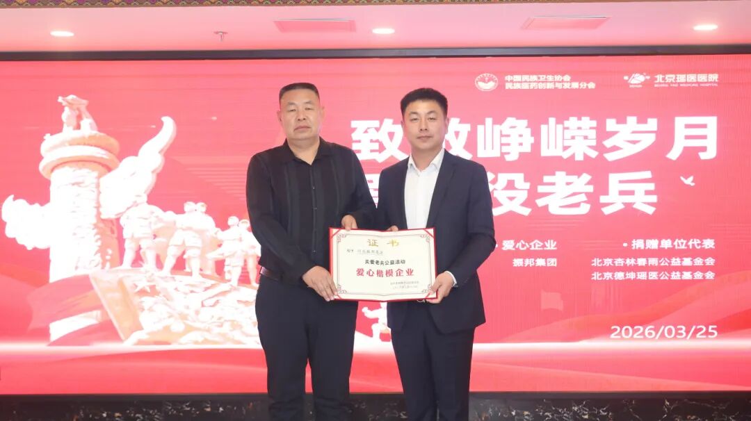 北京杏林春雨公益基金会授予河北振邦集团关爱老兵公益活动爱心楷模企业证书