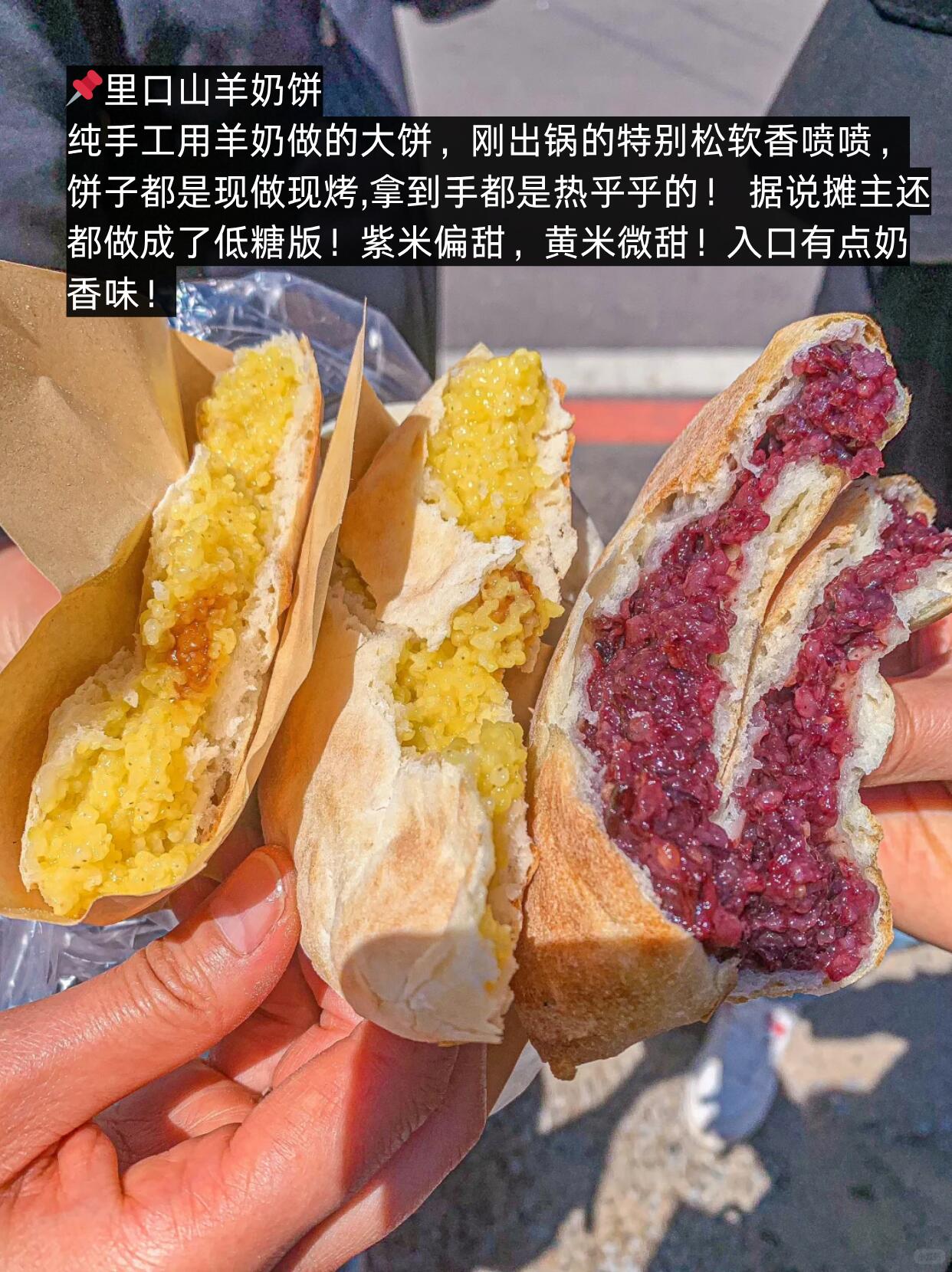 纯手工用羊奶做的大饼,刚出锅的特别松软香喷喷,饼子都是现做现烤,拿到手都是热乎乎的! 据说摊主还都做成了低糖版!紫米偏甜,黄米微甜!入口有点奶香味~