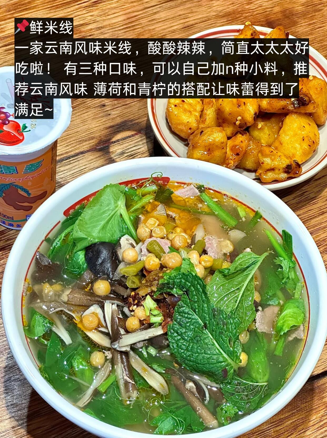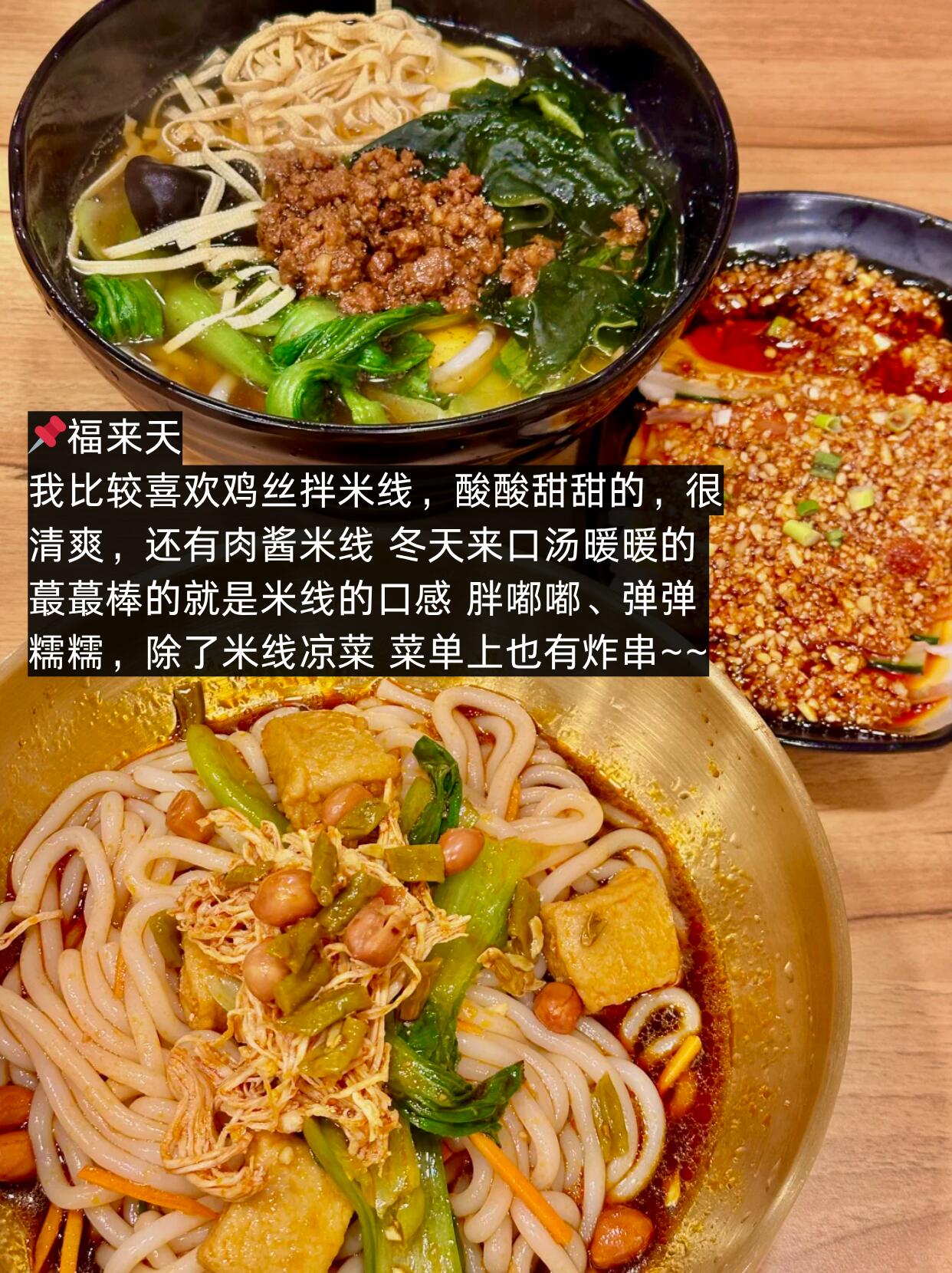 我比较喜欢鸡丝拌米线,酸酸甜甜的,很清爽,还有肉酱米线 冬天来口汤暖暖的 蕞蕞棒的就是米线的口感 胖嘟嘟、弹弹糯糯,除了米线凉菜 菜单上也有炸串~~